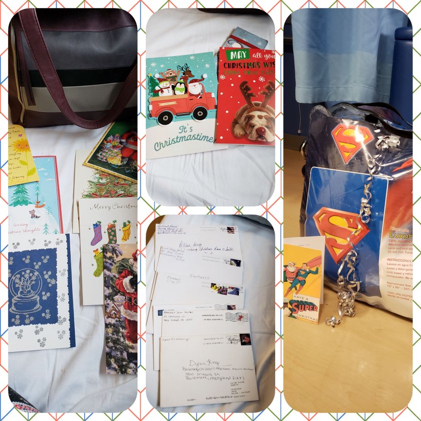 So Superman has been receiving Christmas cards. They only check the mail once a week. But yesterday he received a present from someone and it was a special gift. Thank you so much you know who you are. Superman loves it. I will post more pictures later with his gift when he is more awake. They had to up his seizure medications again and now all he wants to do is sleep. Thanks to everyone who has sent cards also thanks for all the prayers and well wishes. He is continuing to make progress.