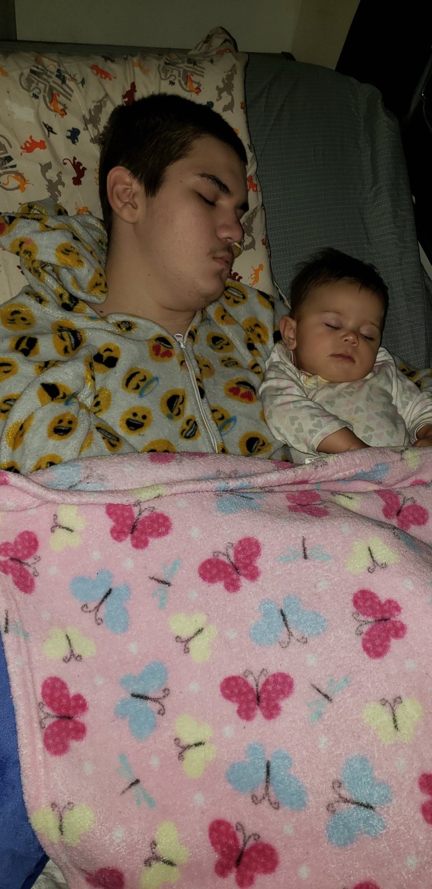 Dylan is not feeling good today because we had to replace the ng tube over the weekend. Everytime we have to put the tube back in Superman ends up sick. He still has been refusing to cough. If we could get him to do that we probably wouldn’t have this problem everytime we replace th ng tube. Please keep him in your prayers and positive thoughts. Thank you in advance. He was resting last night with his niece Delilah. It was so adorable.